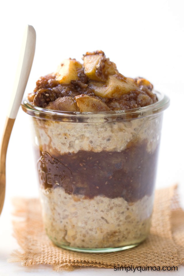 This simple recipe for Apple Pie Quinoa Overnight Oats is packed with nutrients and tastes like apple pie! Since this healthy breakfast recipe is prepared the night before, you don’t have to worry about whipping anything up early in the morning. That makes it a simple, healthy and absolutely delicious way to start the day.