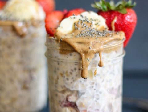 Just mix some vanilla greek yogurt and unsweetened vanilla almond milk with a mashed banana, then add in oats and chia seeds and stir in some diced strawberries. Place in a jar overnight, then top with creamy, nutty almond butter when you’re ready to eat.