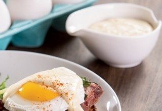 Your Hollandaise Sauce is ready when the color turns lighter and becomes “chiffon yellow”. Adjust the seasonings to suit your taste if you want, then quickly pour over your servings of Eggs Benedict.
