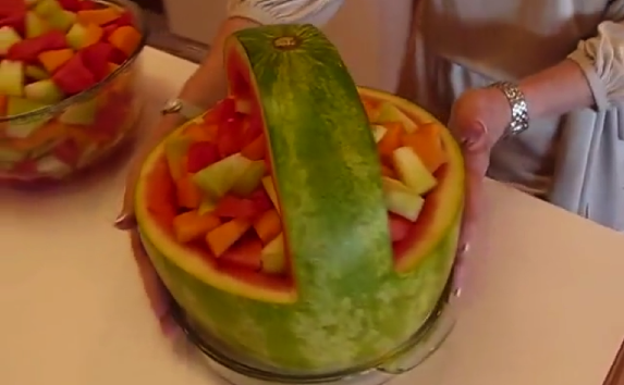 Here’s a conversation piece and creative attention getter for your next party! Rick shows how to carve up a ripe watermelon with a sharp knife to use as a basket for a tasty fruit salad. Betty then adds the pieces of watermelon, cantaloupe and honeydew melon for the salad — but be creative and use any different fruits that you want.